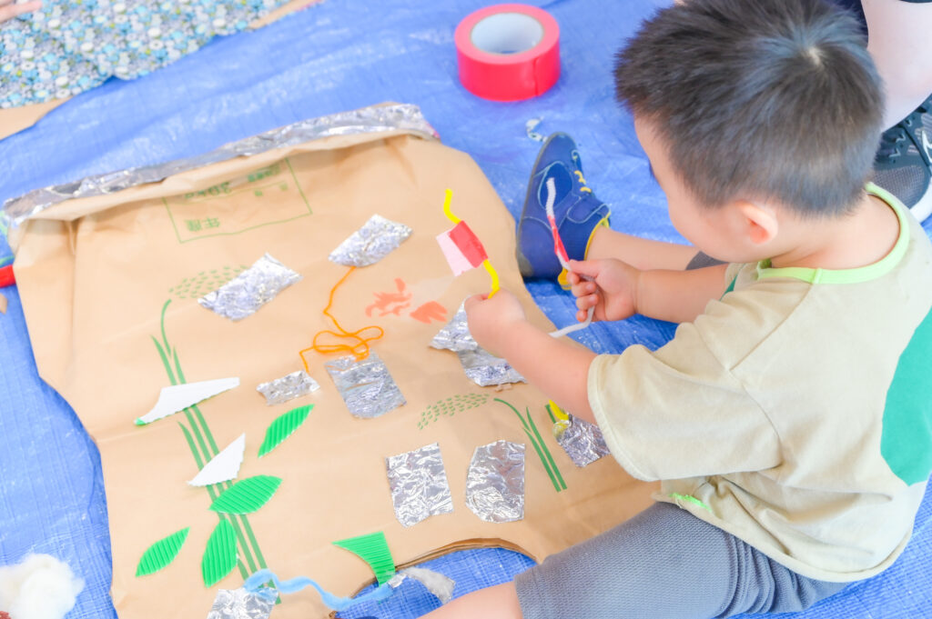 シールを貼ったり画用紙を切って貼り付けたりと、子どもたちは手軽な制作を楽しみながら少しずつ創作の世界に引き込まれていきます。