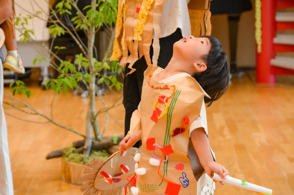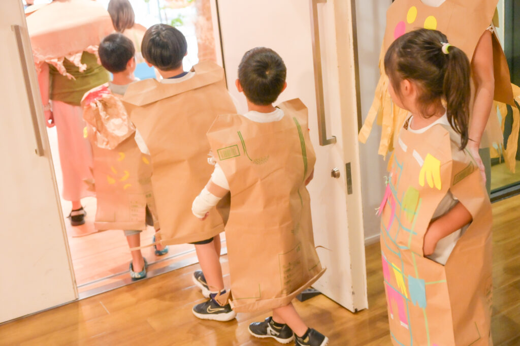 Canaさんから「普段はお米を入れる米袋が、特別な衣装に生まれ変わるよ」というお話があると、子どもたちは目を輝かせて米袋を見つめ、どんな衣装にしようかと真剣に考えていました。
