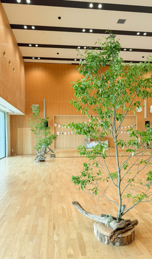 今回はFlorist Salt(ソルト)さんのご協力により、山から切ってきた木を会場に飾りました。木を立てる土台部分の丸太のスライスは、伊東木材株式会社さんにお世話になりました。